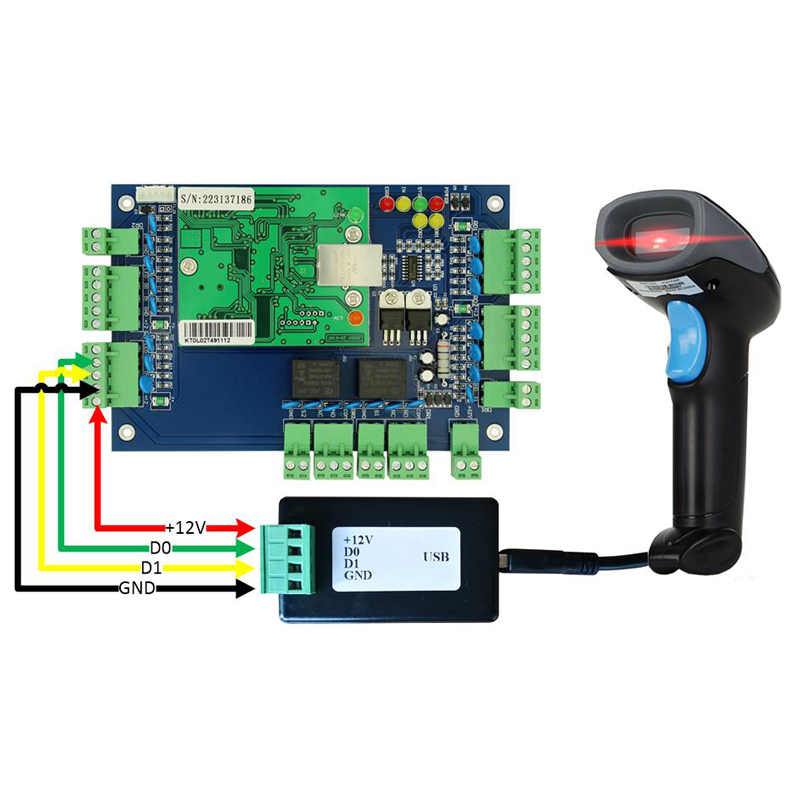 The USB-WG converter takes the barcode and QRCODE from the USB scanner as input, converts it into a standard card reader Wiegand signal output, and connects it to the access controller to replace the traditional access card reader then we could unlock the door by QR code.